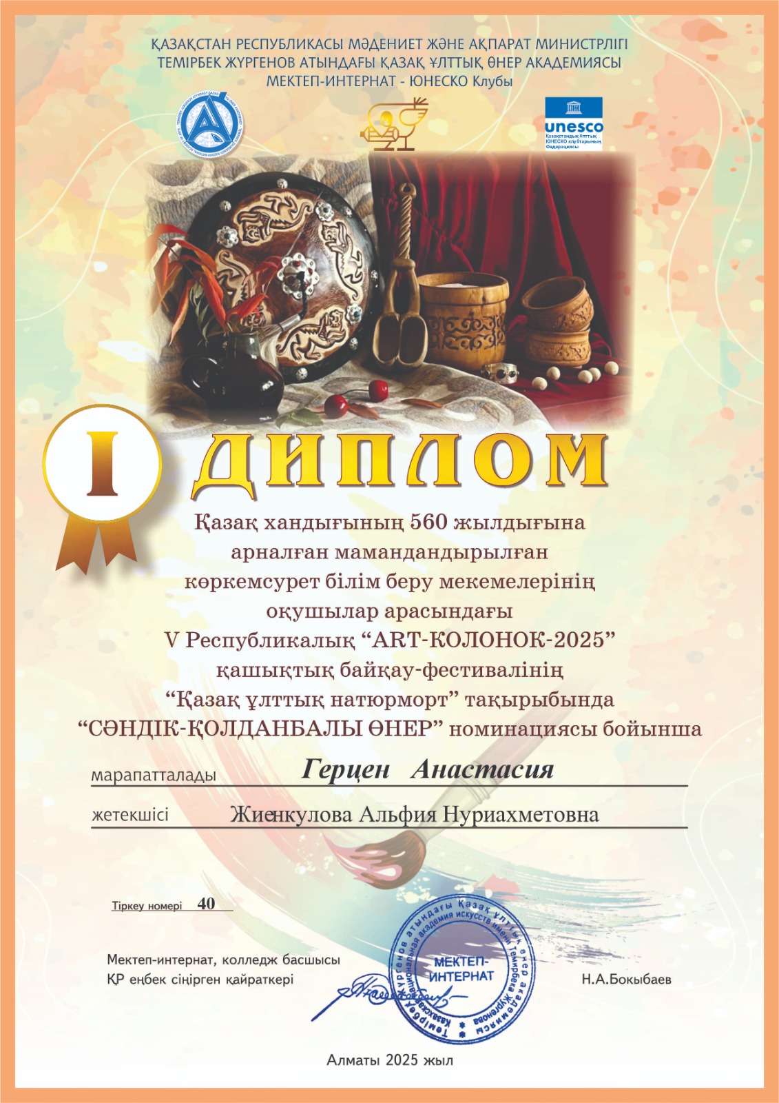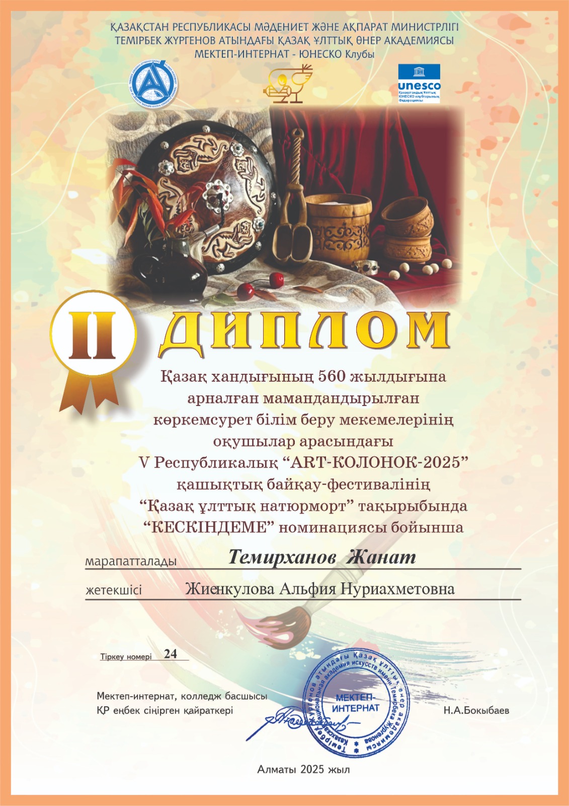 2025 жылғы 01.12–05.12 аралығында ҚАЗАҚ ХАНДЫҒЫНЫҢ 560 жылдығына орай «Қазақ ұлттық натюрморты» тақырыбында мамандандырылған көркем оқу орындарының оқушылары арасында V Республикалық қашықтан өткізілген байқау-фестивалі өтті. Қашықтан өткізілген байқау-фестивальдің ұйымдастырушысы: мектеп-интернат – Қазақстандық Ұлттық ЮНЕСКО клубтары федерациясының қолдауымен Темірбек Жүргенов атындағы Қазақ ұлттық өнер академиясының ЮНЕСКО клубы. Негізгі мақсаты – қазақтың ұлттық бейнелеу және қолданбалы өнерін насихаттау.