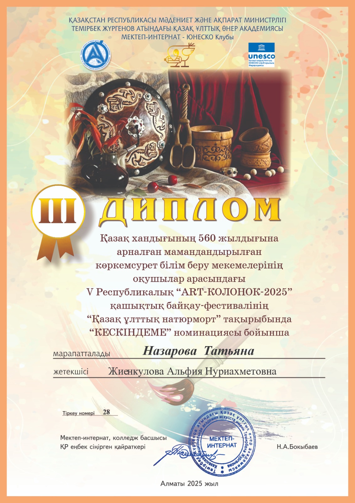 Назарова Татьяна – III дәрежелі ДИПЛОМ (мұғалімі Жиенкулова А.Н.),