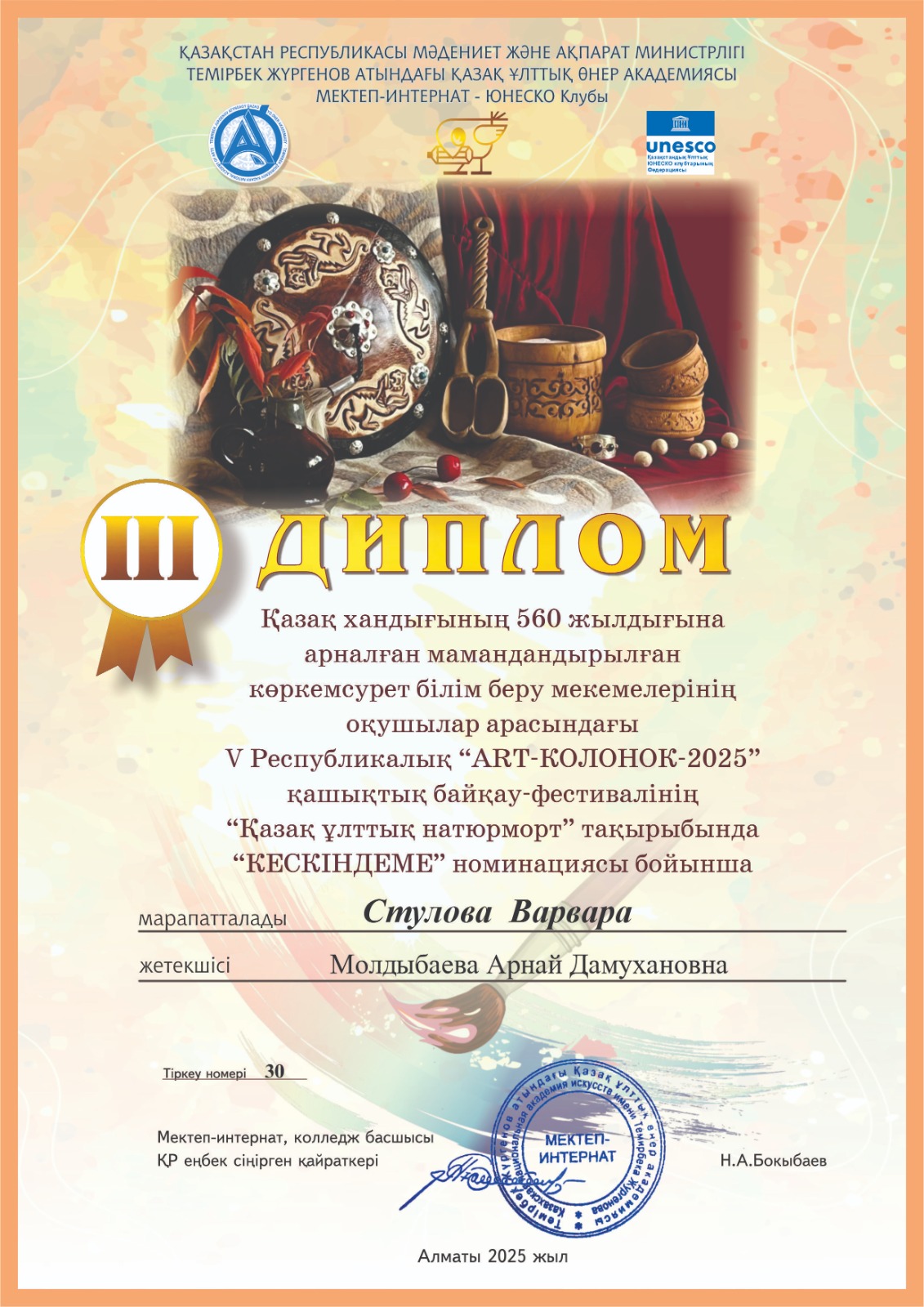 Стулова Варвара – III дәрежелі ДИПЛОМ (мұғалімі Молдыбаева А.Д.).