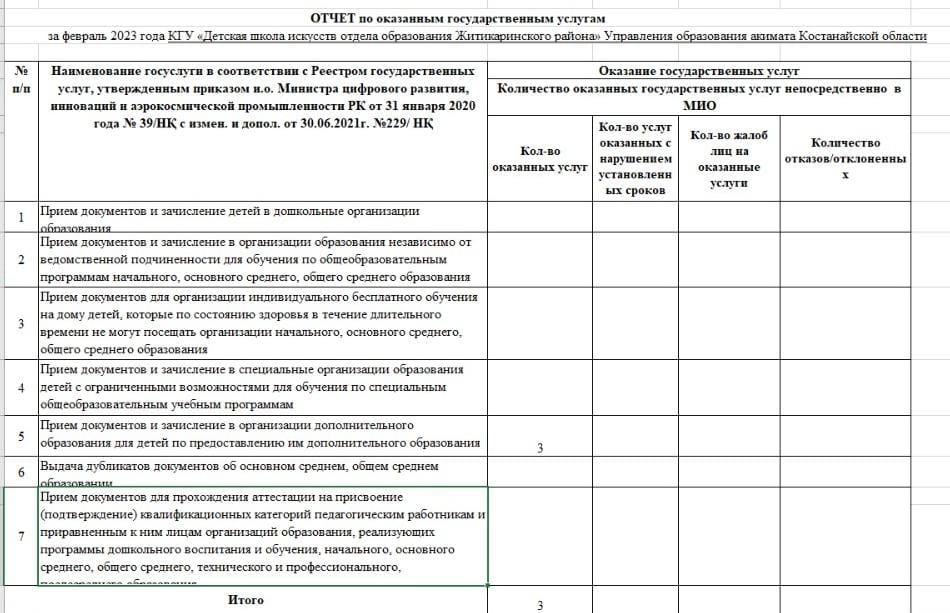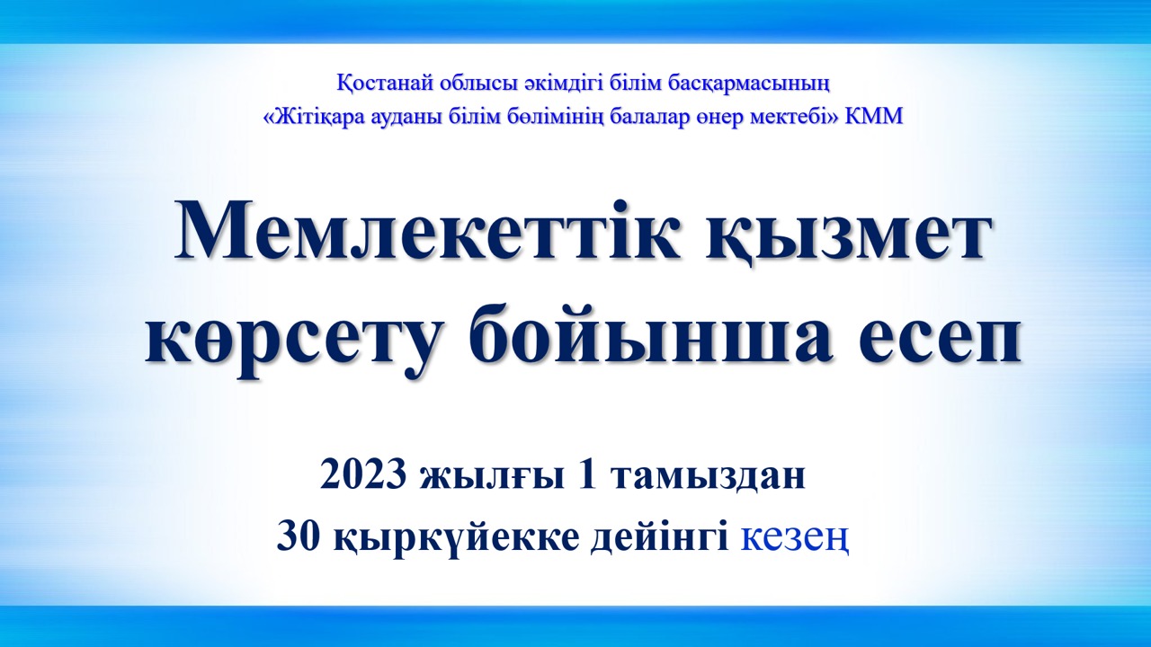 Мемлекеттік қызмет көрсету сапасын бақылау мақсатында Қостанай облысы әкімдігі білім басқармасының «Жітіқара ауданы білім бөлімінің балалар өнер мектебі» КММ ай сайын Қостанай облысы әкімдігі білім басқармасының «Жітіқара ауданының білім бөлімі» ММ мемлекеттік қызмет көрсету есептілігін дайындайды және тапсырады.