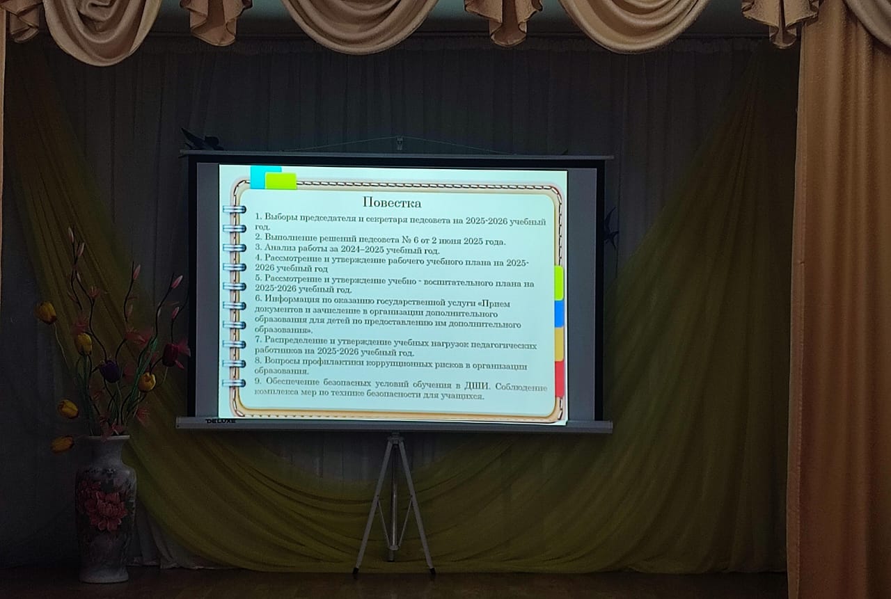2025 жылғы 28 тамызда «Балалар өнер мектебі» КММ-нде №1 педагогикалық кеңес өткізілді, онда келесі мәселелер қарастырылды: