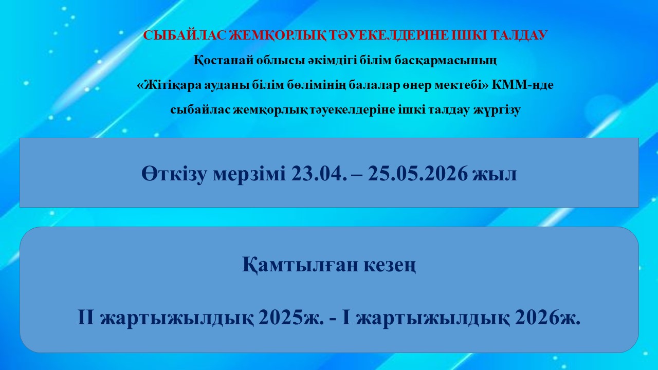 Қостанай облысы әкімдігі білім басқармасының «Жітіқара ауданы білім бөлімінің балалар өнер мектебі» КММ-нде сыбайлас жемқорлық тәуекелдеріне ішкі талдау жүргізу басталады. Өткізу мерзімі 23.04.-25.05. 2026 жыл. Қамтылатын кезең 2025 жылғы II жартыжылдық-2026 жылғы I жартыжылдық.