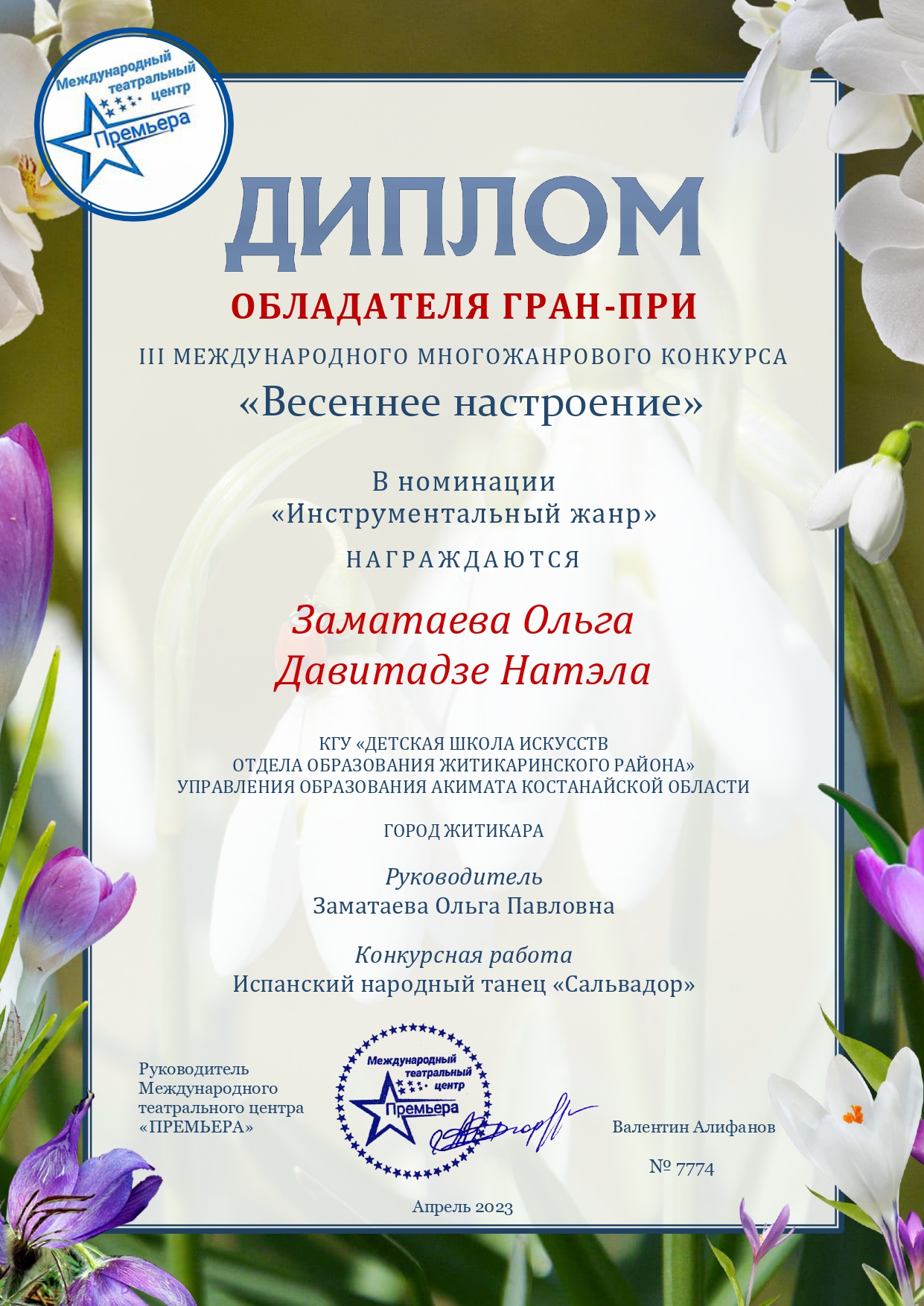 Қостанай облысы әкімдігі білім басқармасының «Жітіқара ауданы білім бөлімінің балалар өнер мектебі» КММ - нен байқауға гитараның мұғалімі Ольга Павловна Заматаева мен оқушы Натэла Давитадзе дуэті қатысты.