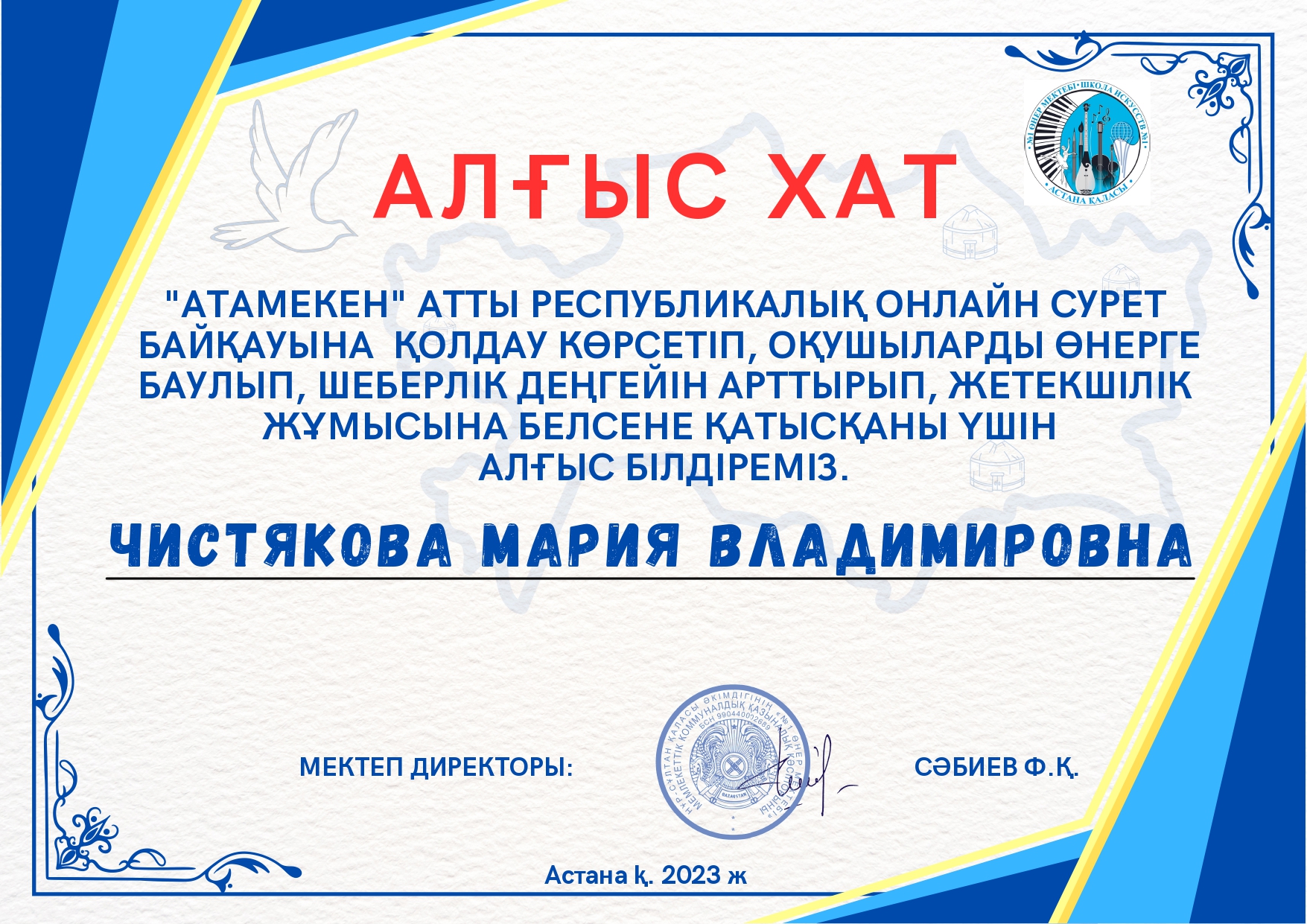 1-17 мамыр аралығында «Атамекен» республикалық сурет байқауы өтті. Байқаудың ұйымдастырушысы Астана қаласы әкімдігінің «№1 өнер мектебі» болып табылады.
