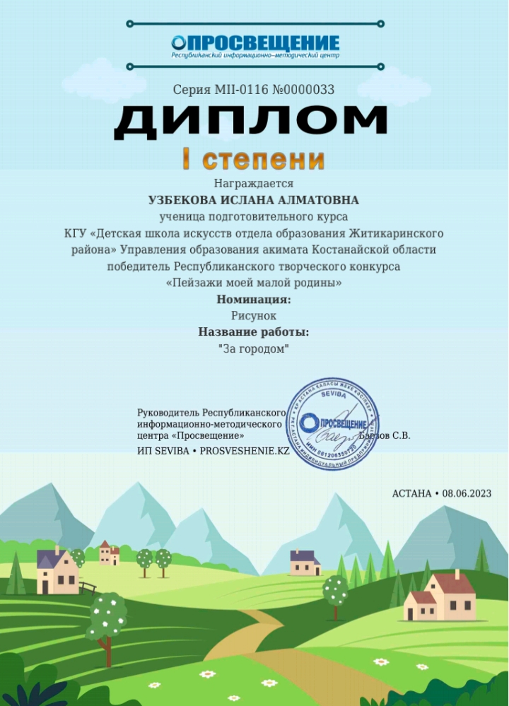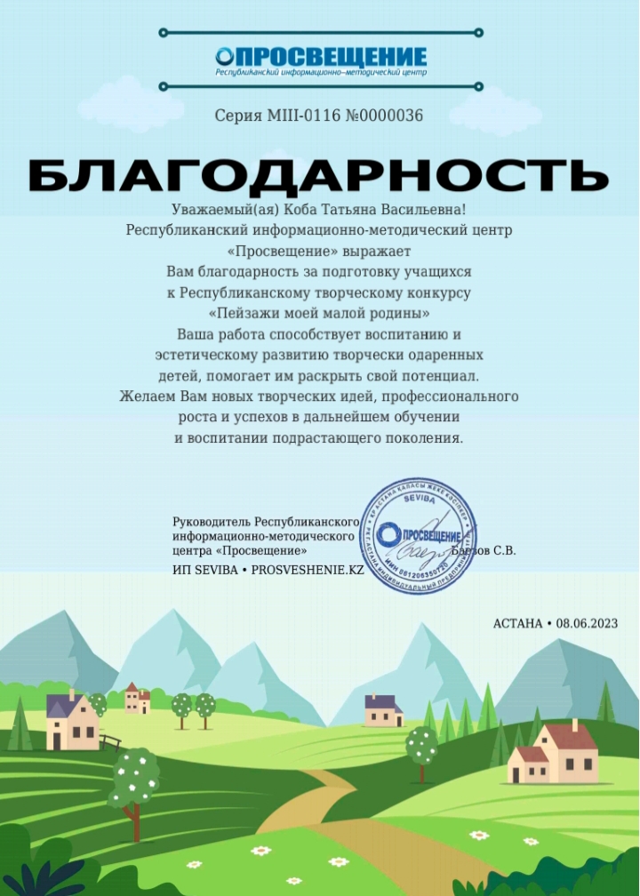 01.05. -31.05 2023 ж.ж. аралығында Астана қаласында «Ағарту» республикалық ақпараттық-әдістемелік орталығы «Менің кіші Отанымның пейзаждары» атты онлайн байқауын өткізді.