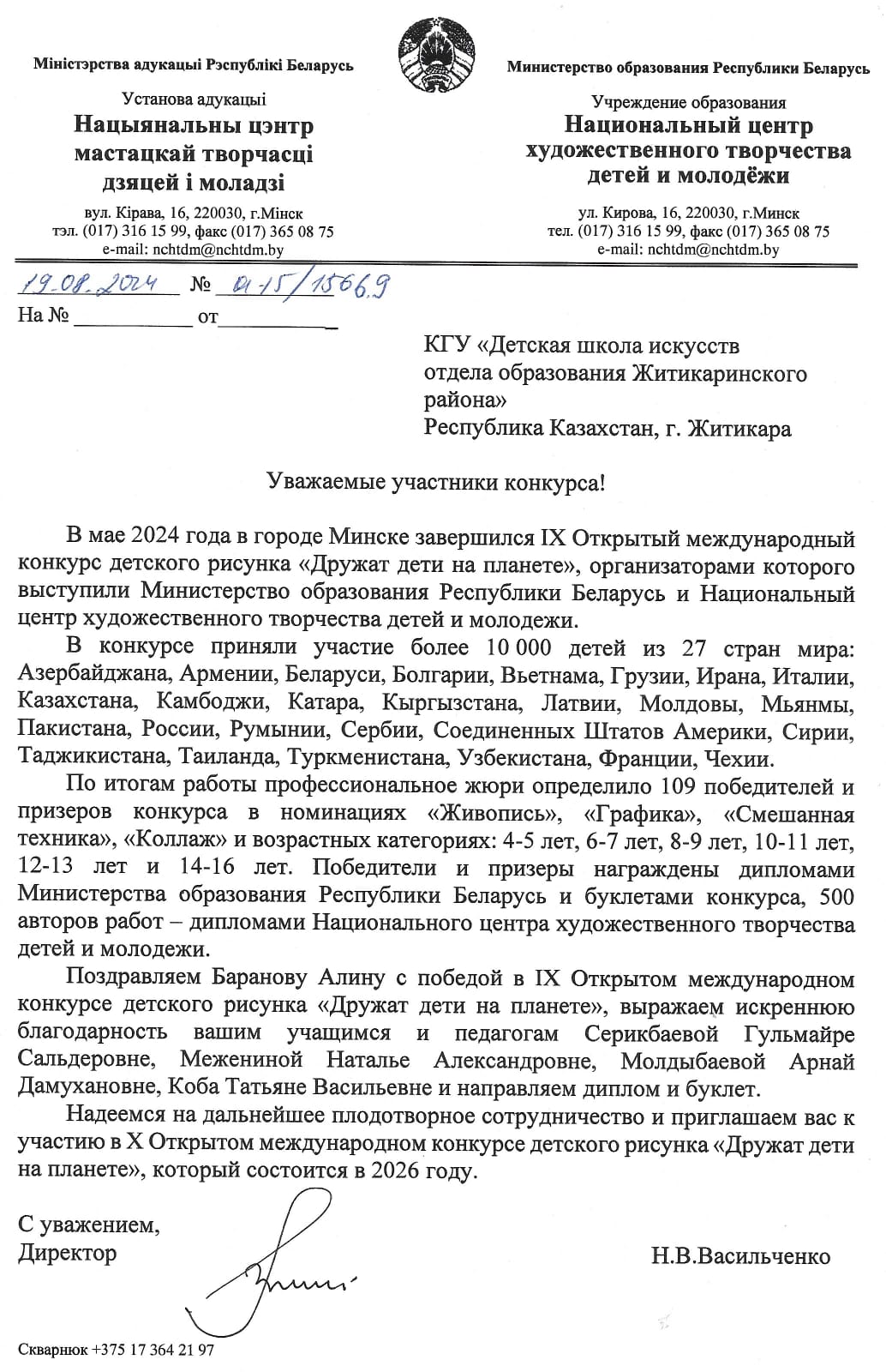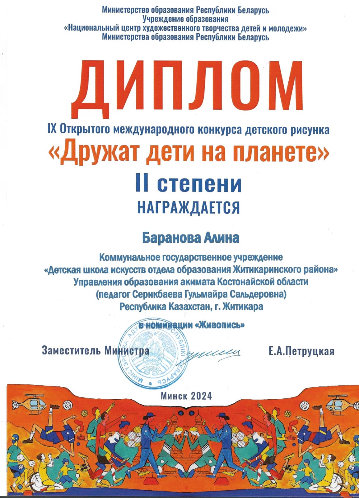 2023 жылдың 1 қарашасы мен 2024 жылдың 30 шілдесі аралығында «Дружат дети на планете» атты IX Ашық Халықаралық балалар суреті байқауы өтті. Байқаудың ұйымдастырушысы Беларусь Республикасы Минск қаласындағы балалар мен жастардың көркем шығармашылығының ұлттық орталығы болды. "#Дети #Будущее #Спорт" байқауының тақырыбы жарияланды.
