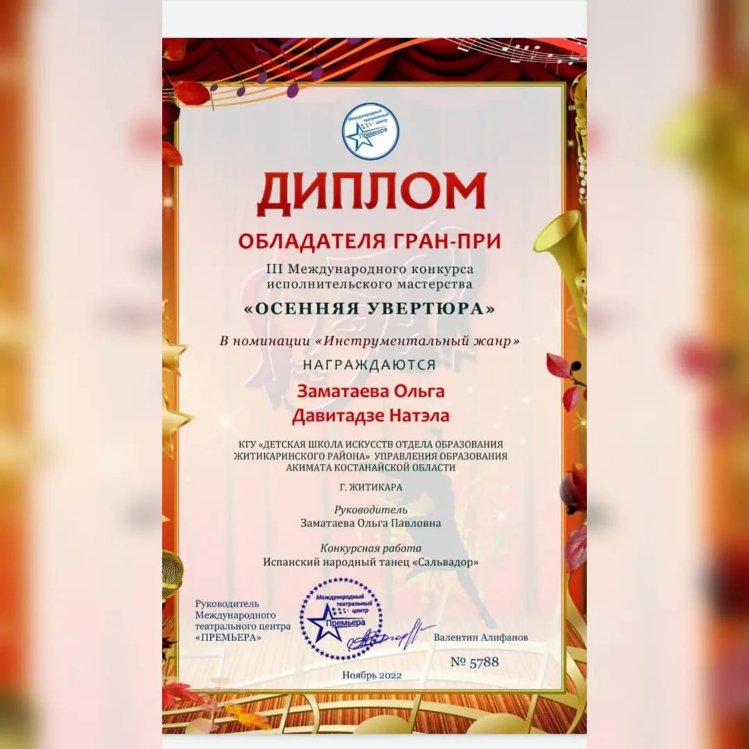 2022 жылғы 26 қарашада Шығыс Қазақстан облысында Шемонаиха қаласында «Күзгі увертюра» III халықаралық онлайн орындаушылық шеберлік байқауы өтті. Байқаудың ұйымдастырушысы «Премьера» Халықаралық театр орталығы болып табылады. Байқау көркем оқу, театр жанры, вокал, аспаптық жанр, хореография, дефиле номинациялары бойынша өткізілді.
