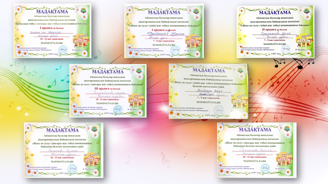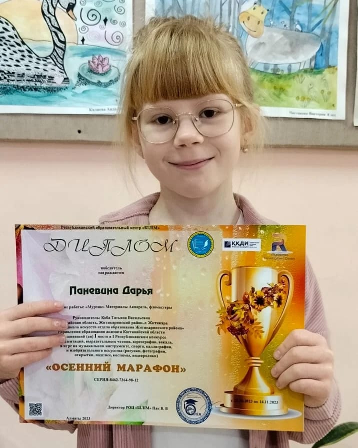 1 курстың оқушылары Бегалинова Дильназ, Казанюк Артем, Давлетова Сафия, Нурина Адия, Стулова Варвара, Сижук Дарья 1 дәрежелі лауреат дипломдарымен марапатталды. Аида Калиева ГРАН-ПРИ иегері дипломымен марапатталды. Мұғалім Коба Т. В. жобаға белсенді қатысқаны және балалар шығармашылығын дамытқаны үшін алғыс хатпен марапатталды.